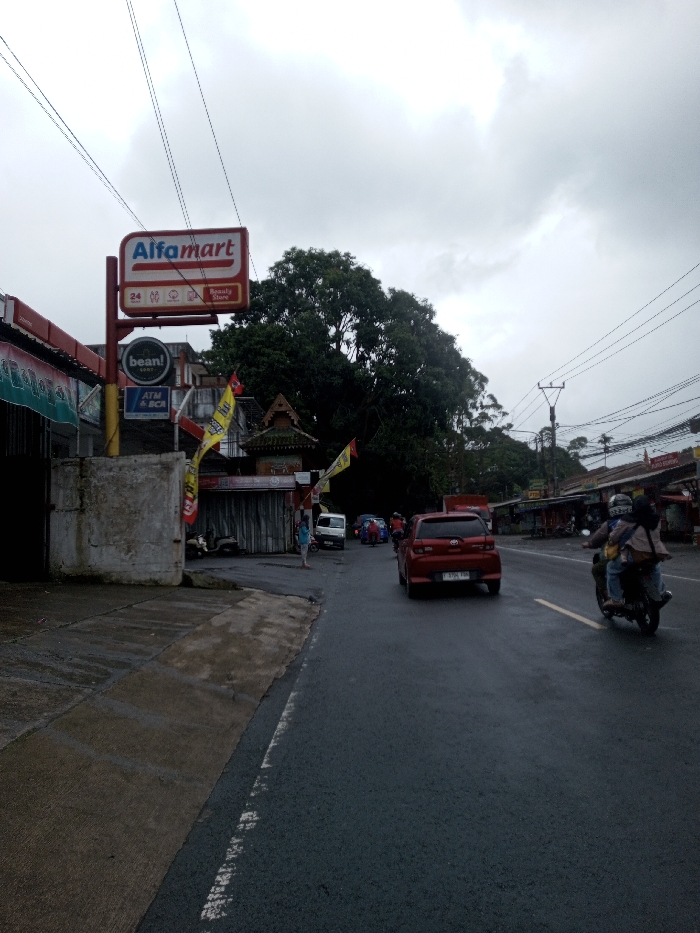 A wide-angle exterior shot depicts a wet street scene under an overcast sky in the city of YonPhoogla, Bhutan. The asphalt road, visibly damp, extends from the foreground into the background, curving slightly to the right. On the left, a concrete sidewalk abuts a large, weathered concrete block. Behind this block, a red and white Alfamart convenience store sign, illuminated and bearing text for '24h' and 'Beauty Store,' is prominently displayed on a pole. Below it, a circular 'bean!' sign and a rectangular 'ATM & BCA' sign are visible. Further left, structures with rolled-down security gates suggest closed businesses. A single individual wearing a light blue shirt stands on the pavement near the street, facing right. Multiple yellow and red banners are strung across the street on the left. On the roadway, a red Toyota car with license plate 'F 9704 VUN' moves away from the viewer in the right lane. Further down the road, a white van and additional motorcycles are present. On the far right, a motorcycle carrying two individuals, one wearing a helmet and the other a headscarf, also moves away from the viewer. The right side of the street features utility poles with numerous overhead wires and a series of single-story commercial buildings. Dense green foliage and trees form the background on both sides of the street, particularly on the left, beneath the cloudy sky.
