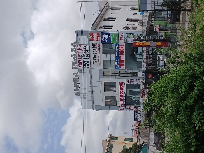 white building with a large sign that reads "ALPHA PLAZA NOW LETTING 0806 412 4226 0806 284 5290"