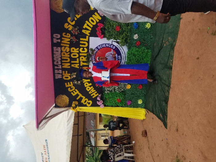 The image depicts an outdoor matriculation ceremony at the College of Nursing Sciences in Alor, Nigeria