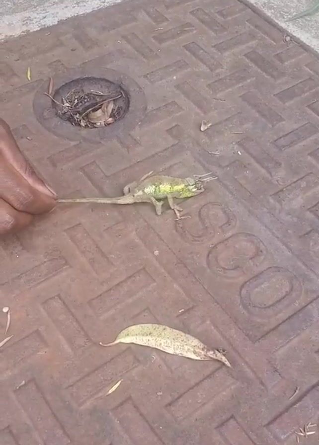 A video depicts a chameleon being released from a person's hand onto a brown, rectangular metal surface with a raised pattern