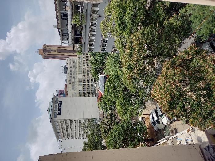 From an elevated viewpoint, a dense canopy of trees dominates the urban landscape. Buildings of varying heights and architectural styles rise amidst the greenery. Several cars are parked in a lot nestled among the trees. The sky features scattered clouds, casting shadows across the scene. A mix of old and modern buildings creates a varied skyline.