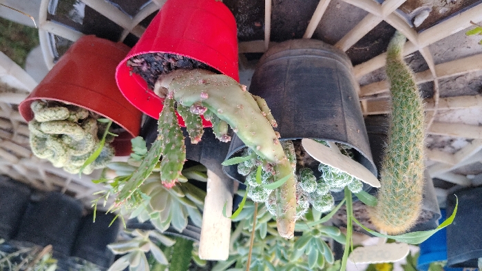 - "Three potted cacti occupy the frame, resting upside-down on a white lattice surface" by FM-tjajG3, licensed under CC BY 4.0