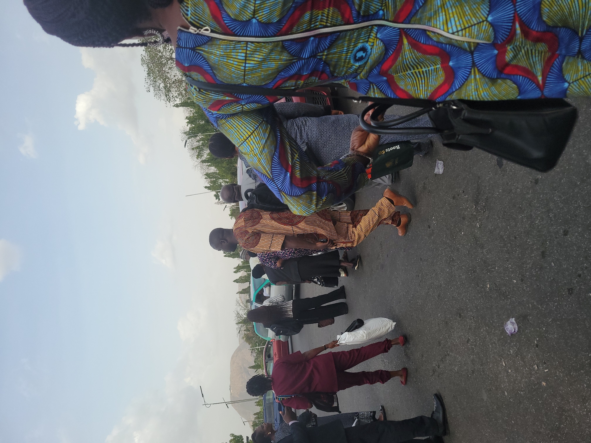 A queue of individuals stands on a paved surface, likely a road, with vehicles parked behind them. The clothing of the individuals varies, including traditional patterns and contemporary styles. A mountain range is visible in the background. The scene is likely taking place in the city of Abuja, Nigeria.