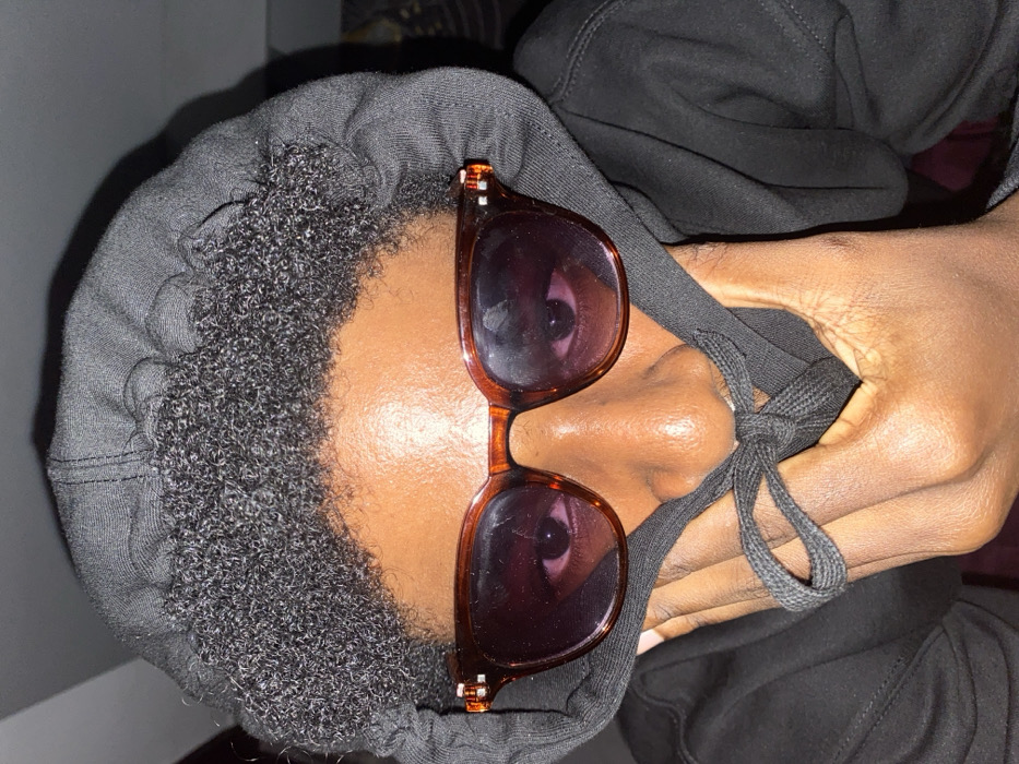 The image depicts a close-up, chest-up view of an individual, situated in the city of Igboefon, Nigeria. The subject has dark skin and wears a black hooded sweatshirt with the hood pulled over their short, tightly curled dark hair. Brown-framed sunglasses with dark, reddish-tinted lenses cover the eyes. The individual's right hand pulls the hoodie's black drawstring taut across the lower face, concealing the mouth and chin, with a knot visible in the drawstring near the hand. The background is uniformly dark and indistinct, suggesting an indoor setting with direct lighting on the subject.