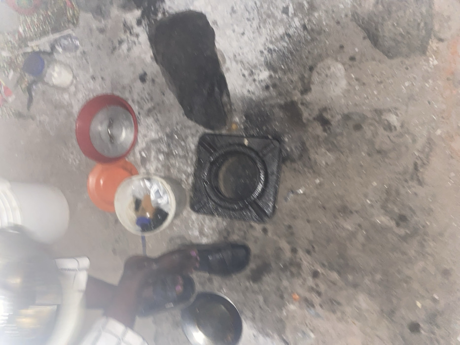 The image presents a ground-level view of a domestic scene in Jos, Nigeria, featuring a concrete or packed earth floor with stains and scattered debris. In the upper left quadrant, the lower torso, legs, and feet of one individual are visible. The individual wears dark-colored sandals. The left leg, from the viewer's perspective, is partially covered by a white and dark-patterned cloth. A dark-skinned hand holds a shiny metal pot or bowl, with motion blur indicating movement or activity. To the left of the individual's feet, a small, dark metal plate rests on the floor. A square, black, single-burner gas stove is centrally positioned in the lower half of the frame. To the right of the stove, a large, dark, irregular-shaped object, possibly a stone or piece of charcoal, lies on the ground. Other objects on the floor include: a white plastic bucket in the upper left-center; a smaller white plastic bucket, located near the center-left, containing various small items in blue, orange, and silver hues; an orange plastic plate and a red plastic bowl holding a metal sieve, both positioned to the right of the smaller white bucket. In the upper right, a clear jar with a blue lid contains a white granular substance, alongside another small, clear bottle.