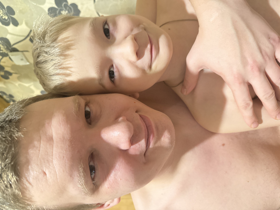 A fair-skinned man and child, possibly father and son, are intimately close, facing the camera. The child, with blond hair, rests their head on the man's chest and looks at the camera with a slight smile. The man also looks towards the viewer. Their skin appears smooth and unblemished, bathed in warm, soft lighting. The man has a scar on his forehead. Only the upper portion of their bodies is visible; the child's arm is thrown across the man's chest.