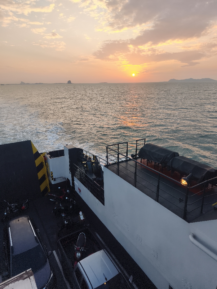 The image depicts a multi-deck ferry traversing open waters in the vicinity of Thong Nian, Thailand, during sunset