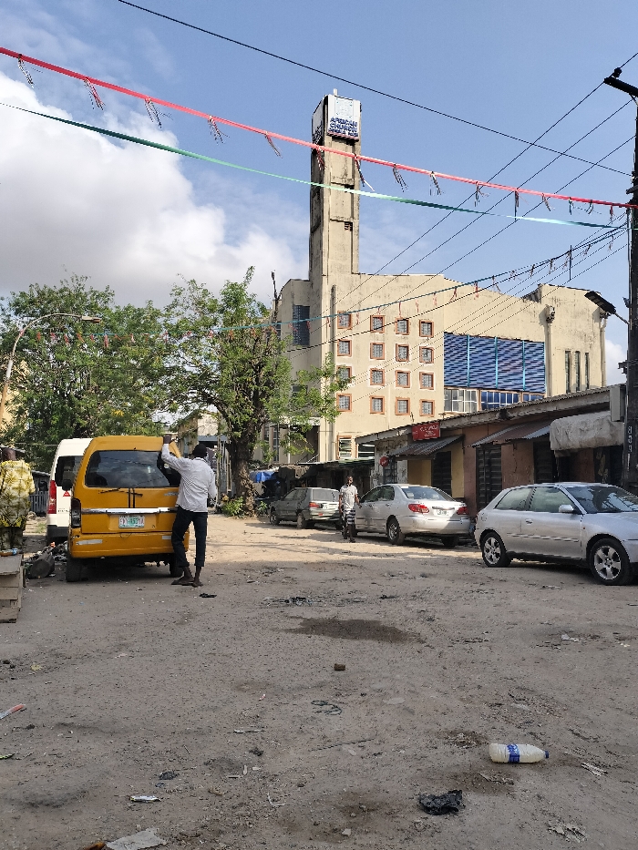 The image depicts a daytime street scene in Lagos Island, Lagos, Nigeria, with the prominent African Church Cathedral Bethel located at 13 Broad Street dominating the background. The environment consists of an unpaved, dusty road exhibiting potholes and scattered debris, including a discarded white plastic bottle in the foreground. Overhead, multiple utility lines and decorative red and green streamers crisscross the sky, which is partly cloudy. Green trees are visible on the left side of the frame, behind parked vehicles. In the background, the multi-story African Church Cathedral Bethel features a tall, light-colored rectangular tower with "AFRICAN CHURCH CATHEDRAL" signage at its peak. The main building facade is characterized by numerous small, square, recessed windows and a modern blue-tinted glass section on the right side. Adjacent to the cathedral on the right are smaller, older commercial or residential structures with corrugated iron roofs. In the mid-ground, a yellow commercial passenger van (commonly known as a "danfo") with a partial white roof is parked, its rear facing the viewer, displaying the license plate "S1-992RY". A male individual, dressed in a white long-sleeved shirt and dark trousers, stands on the left side of the van's rear, with his right arm raised, possibly adjusting or attending to the vehicle. Behind this yellow van, a white van is partially visible. Further to the right, a line of cars is parked along the unpaved roadside, including a silver hatchback (possibly an Audi A3), a silver sedan (resembling a Toyota Corolla), and a darker older sedan. Another male individual, wearing a white t-shirt and striped shorts, walks towards the viewer in front of the parked silver sedan. On the far left foreground, a partially visible person wearing a patterned yellow and green garment stands.