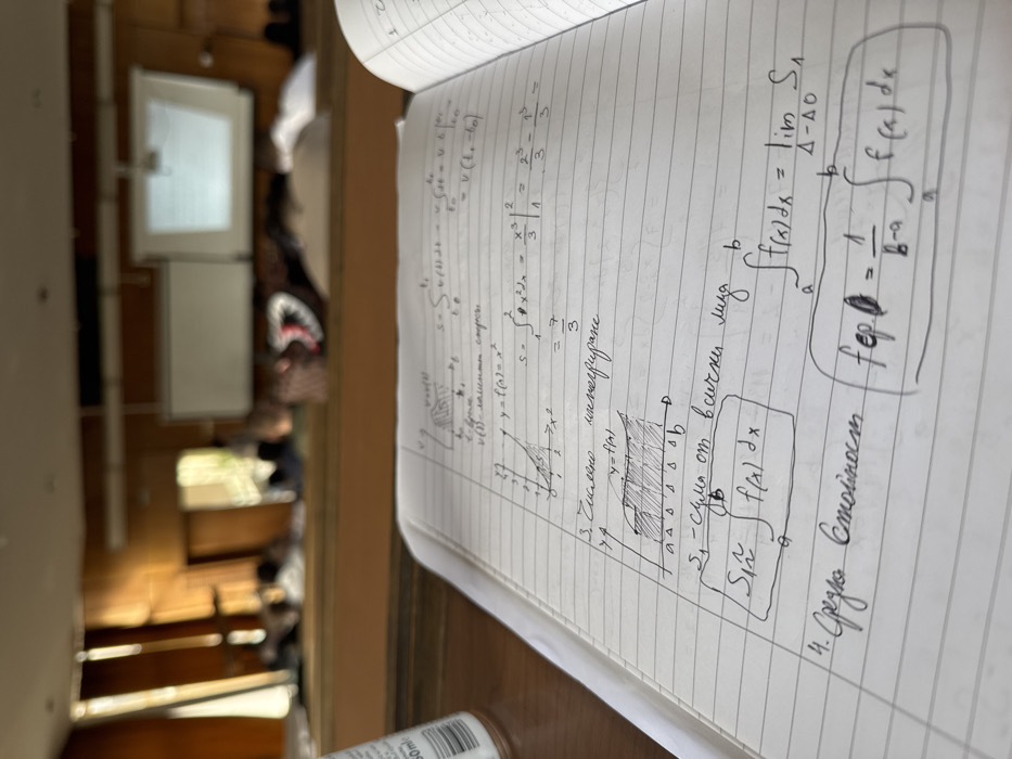 The image displays an academic environment, identified as a university lecture hall in Sofia, Bulgaria. In the foreground, an open, lined notebook occupies the majority of the frame, filled with handwritten mathematical formulas, diagrams, and notes in Bulgarian Cyrillic script. Visible topics include integral calculus, specifically definite integrals, graphical representations of functions, and the "Средна Стойност" (Average Value) theorem. A portion of a white bottle, marked "50ml," is visible on the wooden desk surface to the far left. The background is blurred but reveals a large room with warm wooden wall paneling. Several indistinct figures, consistent with seated students, populate the midground. Bright natural light enters the room from windows on the left. On the back wall, two white boards are present, one of which displays a projected image originating from an overhead projector also visible in the upper midground. The scene suggests an active lecture or study session.