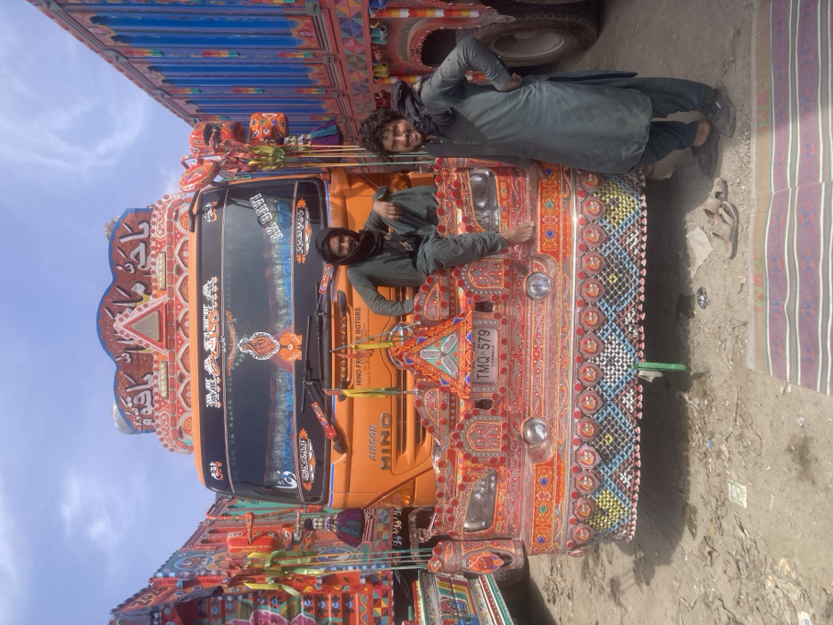 - "The image displays two adult males posing with an elaborately decorated orange Hino truck in an unpaved outdoor environment, located in Kuh-i-Taftan, Pakistan" by FM-7ELnX2, licensed under CC BY 4.0