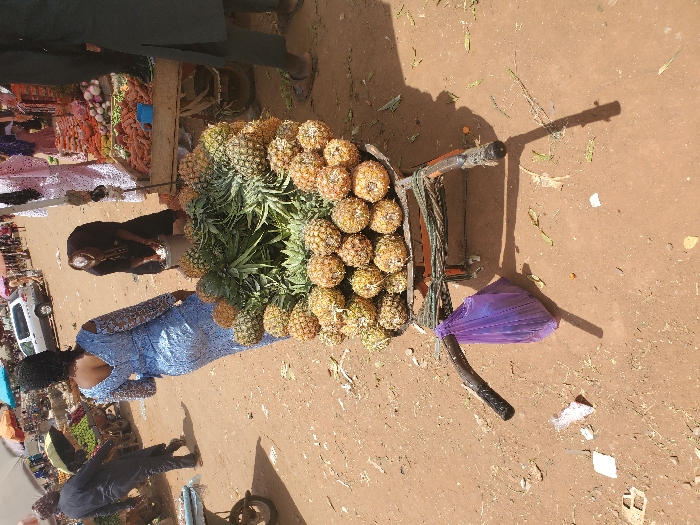 This image depicts an outdoor market scene in Kuje, Nigeria, characterized by a dirt ground and bright daylight. In the immediate foreground, a metal wheelbarrow is laden with numerous whole pineapples, arranged in a circular mound with their green crowns visible. A purple plastic bag hangs from the left handle of the wheelbarrow. To the right of the wheelbarrow, a person's lower legs and feet, clad in dark sandals, are visible. Midground to the left, a woman wearing a light blue, lace-patterned dress with cut-out shoulders and a V-neck back is walking away from the camera. Her dark hair is styled up. Further behind her, a man in a dark blue traditional outfit walks to the left, away from the frame, pushing what appears to be another cart. A white SUV is parked further down the dirt road in the background. Midground to the right, a person in dark clothing, possibly a black abaya or long dress with a head covering, is bent over a white bucket or container, actively engaged in an unknown task. Next to this individual, a market stall displays various fresh produce, including a large quantity of orange carrots in a wooden crate, alongside onions and other vegetables. Overhead, multiple light-colored umbrellas provide shade for various distant stalls and vendors. Scattered debris and small organic matter are visible on the sunlit dirt ground. Shadows of people and objects are cast prominently, indicating direct sunlight.