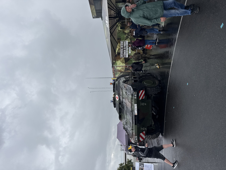 The scene depicts an outdoor public event on a wet asphalt surface under an overcast sky in Oberlungwitz, Germany. A Bundeswehr Boxer Multi-Role Armoured Vehicle (MRAV) in a green camouflage pattern dominates the midground, oriented towards the viewer. The vehicle features a red cross on a white circular background on its roof, indicating an ambulance variant, along with multiple antennas and a German license plate "Y-430 722". Its front bumper displays red and white chevron markings. In the left foreground, a male subject, wearing a black jacket, black shorts, black sneakers with white soles, and a black baseball cap with a yellow brim, is in motion, striding towards the left. In the right foreground, another male subject, wearing a dark green hooded rain jacket, blue jeans, and dark shoes, walks towards the right, holding a lit cigarette to his mouth with his right hand. In the midground, behind the vehicle, several individuals are gathered near a large, camouflage-patterned structure. This structure features a banner displaying the German text "UNTERWEGS, UM DEINE STÄRKEN ZU FINDEN." A camouflage-patterned awning extends from this structure. A male subject in a dark jacket and light pants walks from left to right behind the Boxer's front wheel. Another male subject in military fatigues is visible near the camouflage structure. To the far left, a white canopy tent and an upright display board are partially visible. The asphalt ground reflects the sky and lights, indicating a recent rain or damp conditions.