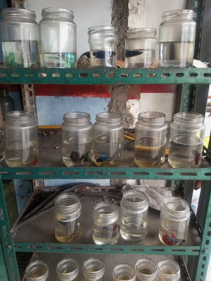 Jars filled with water sit on a green metal shelf. Some jars contain betta fish, visible by their colors, with red, blue, and green present. The jars are arranged on four shelves, with the bottom shelf containing only empty jars. The shelves appear aged and dirty. The jars are various sizes and shapes. In the background, a wall with paint and cement is visible.
