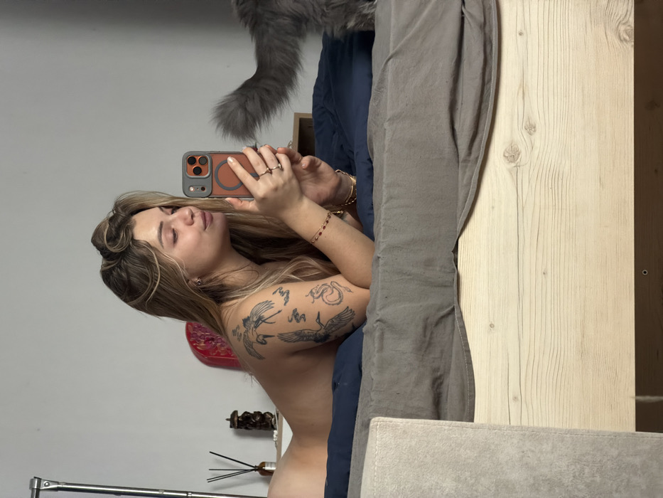 An adult female is depicted lying prone on a bed in an indoor setting within Bolshaya Shilna, Russia. She has fair skin, long blonde hair, and appears to be topless. Her left shoulder and upper arm display multiple dark-ink tattoos depicting birds (specifically cranes) and a serpent. She is wearing small earrings, a ring on her right ring finger, and multiple bracelets (gold-toned and red-beaded) on her left wrist. Her right hand holds a smartphone with a dark grey case and an orange MagSafe ring, indicating she is actively using it, possibly taking a selfie, as she gazes towards the screen. The bed features a light-colored wooden frame, a grey fitted sheet or blanket, and a dark blue pillow or comforter beneath the female's torso. A portion of a grey, fluffy animal, identified as a cat, with its tail and hindquarters visible, is positioned on the right side of the bed, facing away from the camera. In the background, on a light-colored surface, a brown glass diffuser with dark reeds and a dark, multi-faceted decorative statue are visible. A red, curved decorative object is partially discernible behind the female's head. The wall is plain light grey.