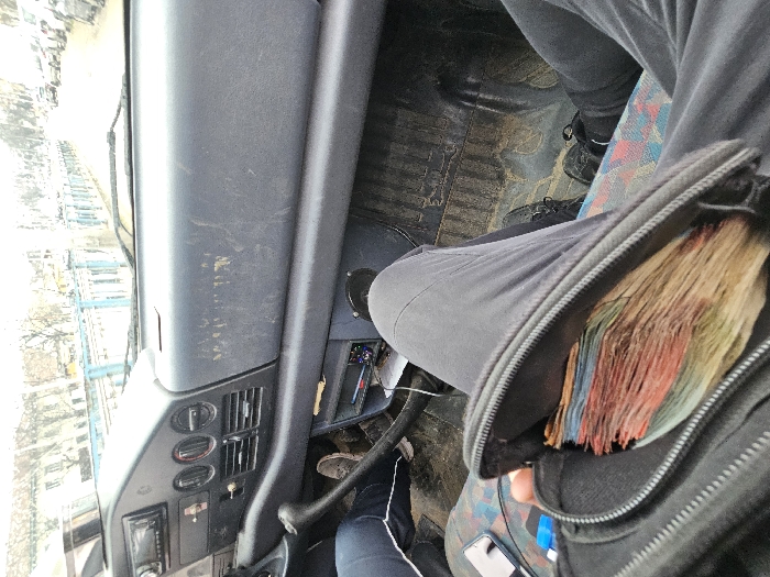 The image displays the interior of a vehicle and an urban street view in Haskovo, Bulgaria, specifically identifiable by the light blue metal barriers on Bul. "Balgariya". The foreground features the legs of an individual seated, holding an open black zippered pouch on their lap. Inside the pouch is a thick stack of multi-colored banknotes, consistent with various denominations of Bulgarian Leva. The individual wears dark grey track pants and black shoes. A silver-backed smartphone and a small blue object are positioned on the patterned fabric seat beside the pouch. The lower legs of a second occupant, wearing dark blue track pants with a white stripe and light-colored shoes, are visible to the left. The vehicle's dashboard is dark-colored, appears worn and smudged, and includes a visible car radio and ventilation outlets. A gear stick is present on the left side. The vehicle's floor is dirty. Through the windshield, an overcast urban street scene unfolds, featuring parked cars along the right, distant buildings on the left, and a prominent light blue metal barrier running parallel to the road, indicative of a bridge or elevated section of road along Bul. "Balgariya" in Haskovo.