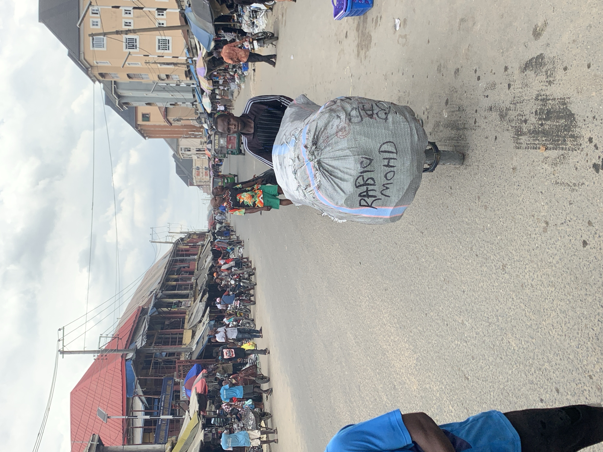 The scene is a bustling street market in the city of Ura Nta Umuarandu, Nigeria, observed during daytime under an overcast sky