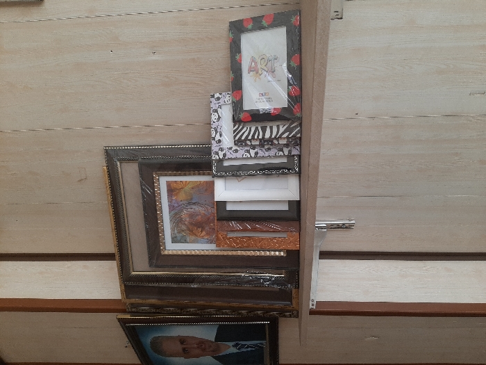 The image depicts an indoor scene within a building in Al-Qadam Municipality, Syria. A light-colored wooden shelf is mounted horizontally against a vertically paneled, light-toned wooden wall. The shelf is supported by at least two visible silver-colored metal brackets. Arranged on the shelf, leaning against the wall, is a collection of diverse picture frames. On the far left, a large, dark-framed portrait features an adult male with short gray hair and a light beard, wearing a dark suit with a light shirt and striped tie, looking directly forward with a slight smile. To its right, several larger, rectangular frames are stacked or leaning; the largest visible frame has a dark, ornate edge with a gold inner trim. Inside, another frame contains an abstract art piece with warm orange, yellow, and brown tones. Many of these larger frames are covered in clear plastic film. To the right of the larger frames, a series of smaller frames are displayed: a brown frame with a textured pattern, a plain white frame, a dark frame, a white frame with a black panda pattern, a black and white zebra-striped frame, and a black frame adorned with red strawberries, which contains a graphic with the word "ART." The environment suggests a retail display or personal collection.