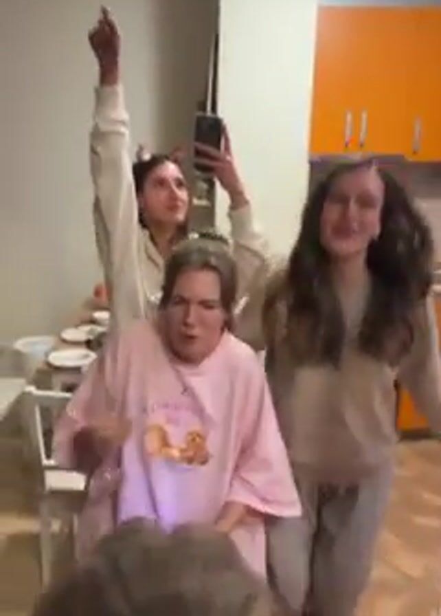Three young women are dancing in what appears to be a kitchen or dining area, with another person’s head briefly entering the frame in the foreground