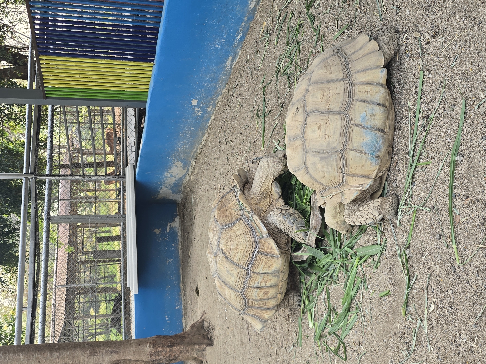 The image displays two large, tan-colored tortoises, likely African Spurred Tortoises, situated on dry, sandy soil scattered with green grass. The tortoise on the left is actively consuming a pile of green foliage. The tortoise on the right, positioned slightly lower and to the foreground, has a visible light blue mark on the lower right side of its shell and is also near the grass. A blue-painted concrete wall, showing signs of wear and chipping, forms a barrier across the midground. Behind this wall, a metal chain-link fence encloses a separate area where several light brown deer-like animals are visible, along with shelters constructed with corrugated metal roofs and supporting poles. A thick tree trunk is present on the far left, partially obscured by the foreground. To the right in the background, a section of vertical metal slats painted green, yellow, and blue acts as another barrier. The scene is outdoors and well-lit, located in Ban Phaya Kot Ana Kaeo, Thailand.