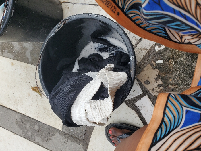 - "The scene, captured in Isunba, Nigeria, presents a high-angle view of a person's lower body and laundry implements on a tiled outdoor surface" by FM-TaWbl2, licensed under CC BY 4.0