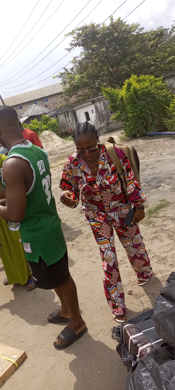 This image depicts an outdoor, unpaved area in Ohoro, Nigeria, characterized by sandy ground and an overcast sky with visible overhead power lines. In the foreground, a woman with braided hair, wearing sunglasses, a long-sleeved multi-colored patterned shirt, and matching trousers with "ROYCE" branding, is positioned slightly right of center. She carries a light brown backpack on her right shoulder, holds a black smartphone in her left hand, and a small, light-colored object in her raised right hand. She wears white open-toed sandals. To her left, a male figure is visible from the back, wearing a green basketball jersey with "80" and "37" printed, black shorts, and dark grey slide sandals. He holds a clear plastic water bottle in his left hand. A third individual, wearing a light green dress and blue sandals, is partially visible to the far left. On the ground in the lower left, a light brown cardboard box with white tape is present. To the lower right, multiple dark plastic bags are stacked, one revealing a rectangular package wrapped in black and white material. The background features a large, light-colored building with a grey sloped roof and multiple blue-framed windows on the upper level. To its right, smaller, weathered concrete structures with a doorway and a small window are visible. Various green trees and shrubs populate the middle ground and background, including a prominent tree with dark green foliage. A large pile of light-colored sand is situated between the individuals and the background structures.