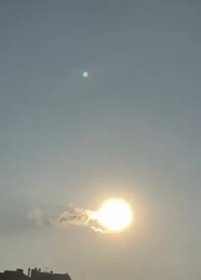 The video depicts a view of the sky with the sun partially obscured by a small cloud. Above and to the left of the sun, there is a small, green circular object. In the foreground, the top of a building with multiple stories is visible. The sky is a light blue, and the overall lighting suggests it is either sunrise or sunset.
