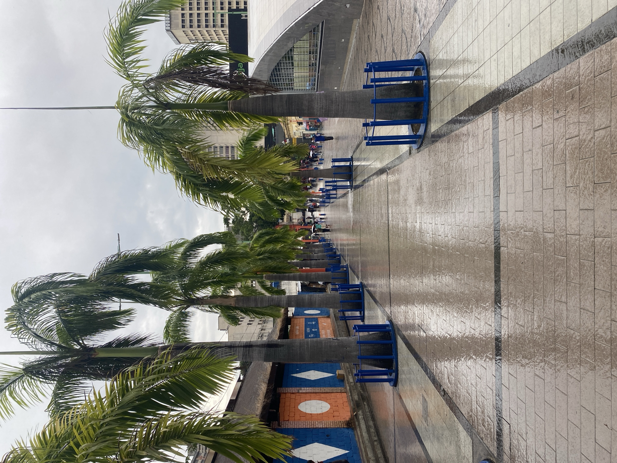 The image depicts a row of palm trees lining a pedestrian walkway in Valencia, Venezuela. The trees are planted in circular concrete structures, surrounded by blue metal protective barriers. The walkway is paved with rectangular tiles, wet from recent rain. A grey sky suggests overcast conditions. In the distance, indistinct figures of people are visible, clustered near what appears to be a building. The trunks of the trees are positioned beside a wall painted with alternating sections of blue and orange, adorned with white diamond and circular shapes. A tall building is visible in the upper left of the image. The reflection of the sky and surroundings are visible on the wet pavement.