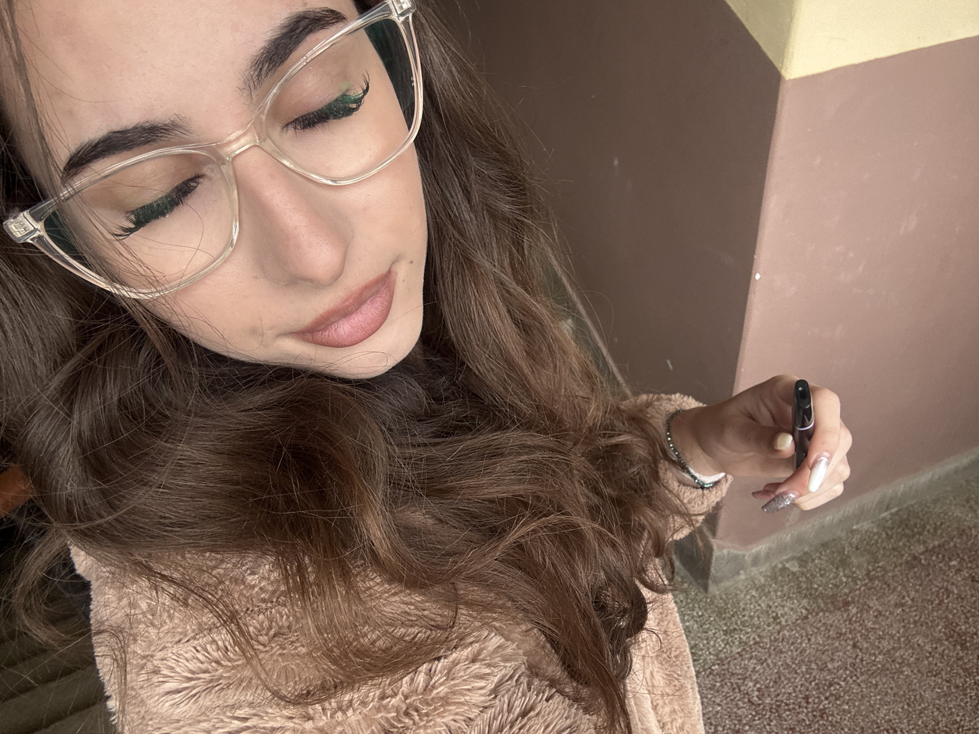 The image displays a close-up, downward-angled view of a young female subject within an indoor environment. The female, positioned prominently in the upper left, possesses long, wavy, dark brown hair partially obscuring her face and shoulders. She wears clear, cat-eye framed eyeglasses. Her eyes are closed or heavily downcast, accentuated by prominent dark green eyelashes. Her lips are colored with a light pink or nude lipstick. She is dressed in a light beige, textured, long-sleeved garment. Her left hand, adorned with a multi-bead bracelet on the wrist, exhibits manicured nails: the thumb and index finger are painted a light, solid color, while the middle and ring fingers feature silver glitter polish. This hand holds a black, cylindrical object, approximately 10-12 cm in length, consistent in appearance with an electronic vaporizing device. The background reveals an interior corner formed by two painted walls. The wall on the viewer's left is a solid dark brown. The adjacent wall to the viewer's right is a faded mauve/pink, topped by a distinct horizontal band of light yellow paint near the ceiling line. The floor, visible in the lower right quadrant, is a speckled terrazzo-style surface featuring light and dark aggregate particles. The scene is illuminated by ambient indoor light. The environment is consistent with an indoor corridor or hallway. The precise location within Yambol, Bulgaria, cannot be determined from the visual evidence provided.