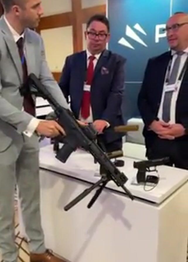 Three men are standing behind a white table that has four firearms on it. The man on the left, dressed in a grey suit and brown shoes, is handling a black rifle with a bipod. The man in the middle is wearing a navy suit with a red tie, and glasses. The man on the right is in a navy suit and patterned tie. They are all standing in front of a blue and white backdrop with a company logo on it. The area appears to be a conference room or event space.