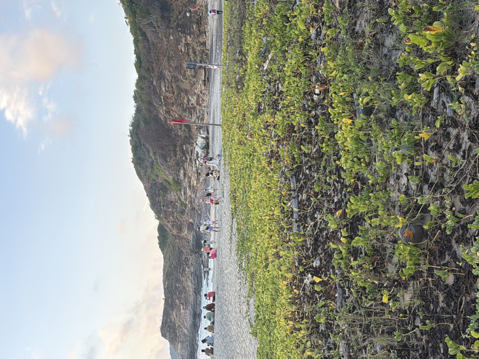 A beach scene shows a group of people gathered at the shoreline, near a rocky cliff face. A red flag stands prominently on the beach. In the foreground, lush green vegetation covers the ground, contrasting with the sandy beach and the rocky terrain. The sky is partly cloudy, suggesting either early morning or late afternoon light.