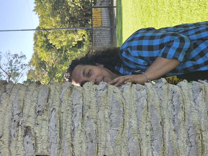 A single individual is observed partially concealed behind a large, textured palm tree trunk in a public green space. The subject, with dark, curly hair, is positioned to the right of the trunk, revealing the right side of their face, including the right eye and mouth, directed towards the viewer. They are wearing a blue and black plaid long-sleeved shirt over a dark garment, with a silver-colored chain bracelet visible on the left wrist. The left hand rests on the pale, deeply segmented bark of the tree trunk. To the right of the subject, a bright green lawn extends to a dark metal fence displaying yellow graffiti. Beyond the fence, a dense cluster of green-leafed trees and a tall, slender grey pole are visible against a clear blue sky. The environment, including the specific type of palm tree (likely *Phoenix canariensis*), is consistent with a public park or plaza within Buenos Aires, Argentina.