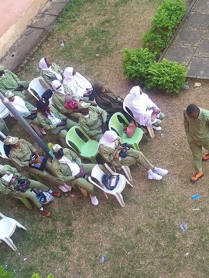 A high-angle forensic photograph depicts an outdoor gathering of approximately 15 individuals on a dry, patchy grassy area within an urban environment. The specific location is an open ground adjacent to a light-brown building structure and a concrete pathway visible along the upper left edge. Most individuals wear olive green uniforms comprising long-sleeved shirts and trousers, indicative of a formal service corps. Several women are observed wearing head coverings in white, light pink, or dark green/olive. The subjects are seated on a mix of white and light green plastic chairs, arranged in loose rows. One uniformed male stands on the right side of the frame, looking downwards. Personal items, including handbags, a patterned tote bag, and a white helmet, are visible on or near the individuals. Footwear varies and includes white sneakers, brown boots, and sandals. The grassy ground contains scattered litter such as plastic wrappers and a blue medical mask. Manicured green shrubs form a linear border in the upper right portion of the scene. The area is illuminated by natural daylight.