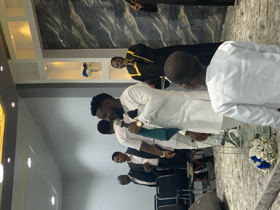 This image captures an indoor scene in Gbawe, Ghana, featuring multiple individuals within a modern, well-lit gathering space, likely a church or event hall