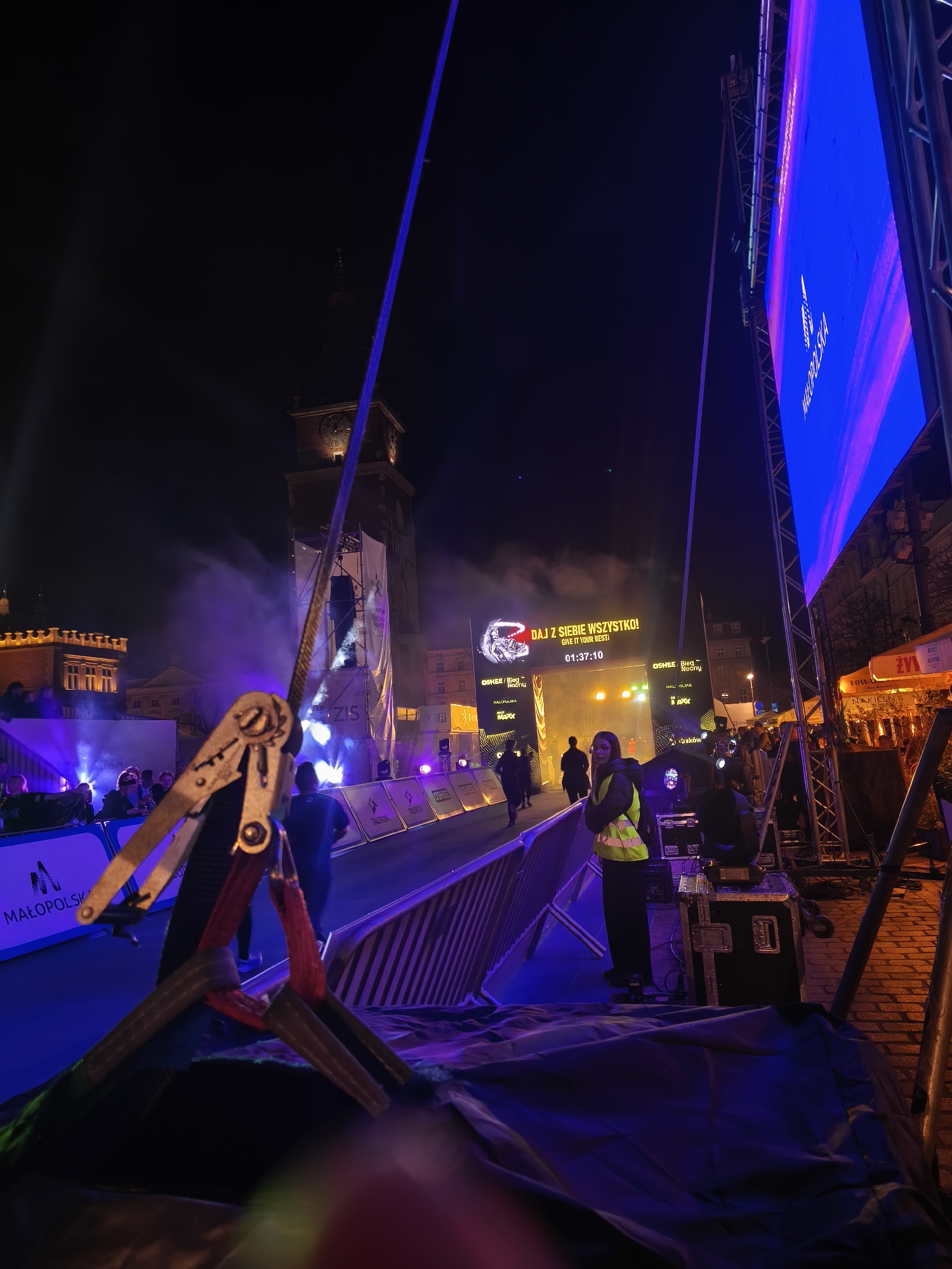 Here is a detailed description of the image: **Scene Overview:** The image captures an outdoor scene at night, likely in Krakow, Poland, during an event, possibly a race or festival. The overall ambiance is lively, with event lighting and a noticeable presence of people. **Location:** The scene is set in a public square or street in Krakow, Poland, as evidenced by architectural details, including what appears to be the clock tower, signage, and banners with Polish text. **Subjects and People:** * Participants: Several individuals are running or walking toward what appears to be a finish line or stage marked by illuminated signage and event infrastructure. * Event Staff/Security: A person wearing a yellow safety vest stands near equipment, possibly an event organizer or security personnel. * Spectators: People can be seen on the periphery. **Objects and Environment:** * Event Infrastructure: The scene includes a large digital screen, stage-like setup, barriers, and professional lighting. * Finish Line/Stage: The archway or banner displays the words "DAJ Z SIEBIE WSZYSTKO!", in Polish, which translates to "GIVE IT YOUR BEST!". Beneath this inscription, there is a time, "01:37:10." * Advertising/Branding: Logos of brands such as “TAURON”, “ZIS”, “OSHEE” and “MAŁOPOLSKA” are visible, indicating sponsorships or partnerships with the event. * Lighting: A combination of blue, purple, and yellow lights illuminates the scene. **Actions and Interactions:** * Event Participation: People are actively involved in the event by running or spectating. * Event Management: Event staff are monitoring and managing the activity. **Overall Impression:** The image portrays an active, organized event at night in an urban setting. The presence of event infrastructure, participants, and advertising elements suggest a well-planned and attended public gathering. The lighting and signage create an exciting and festive atmosphere.