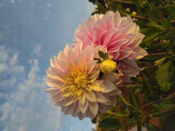This image depicts a close-up view of two dahlia flowers and one bud in a garden setting, located in Paktho, Laos. The prominent flower on the left features multiple layers of light pink petals that transition to a yellow-cream hue at its densely packed center. To its right, another dahlia flower displays multiple layers of uniformly pink petals. A spherical, greenish-yellow bud is situated between the two open flowers. Dark green stems and leaves are visible in the lower portion of the frame, partially in shadow and partially illuminated. The background consists of a clear blue sky with scattered white cumulus clouds. A faint line of darker vegetation is discernible on the horizon to the left. The scene is illuminated by natural light, suggesting either early morning or late afternoon, with highlights evident on the flower petals and foliage. No human figures are present.