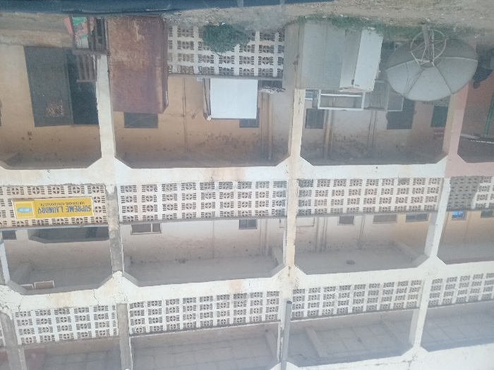 A multi-story building with rectangular, porous brickwork is pictured. Balconies extend from each level, marked by square openings. A satellite dish is mounted on the top level. A sign for "Supreme Laundry" is visible on one of the lower balconies. The building appears weathered. The angle and composition of the image give an unconventional view of the structure.