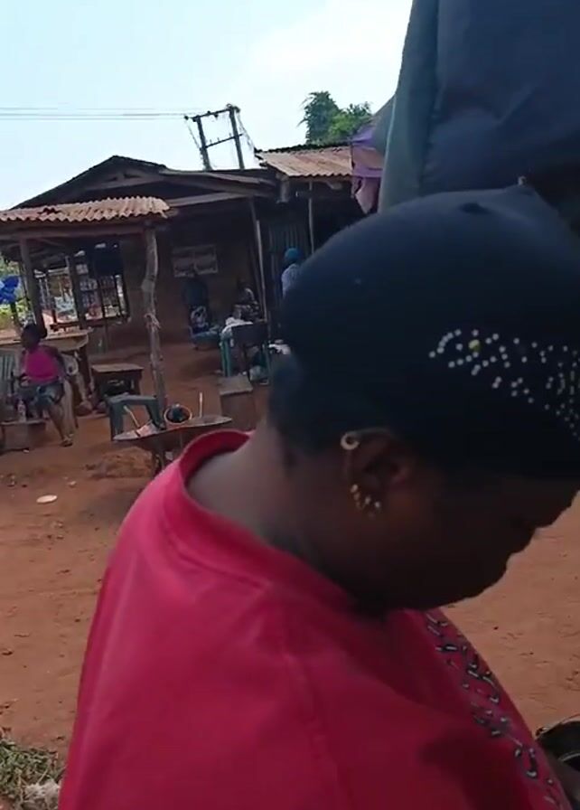 scene in a market in what appears to be a rural setting. There is red dirt on the ground. Several people are present. A woman with a black head covering with rhinestones is visible in the foreground. A man wearing a patterned shirt and black pants is next to her, holding a black plastic bag. The table in front of him is covered with produce, including tomatoes, peppers, onions, okra, and bananas. A blue tarp is stretched over the area for shade. In the background, people are sitting and standing around small tables under the cover of a tin roofed structure. A motorcycle is visible in the background.