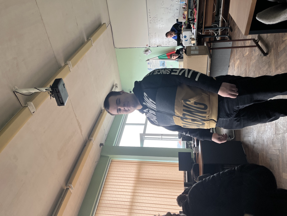 This image depicts an indoor scene, likely a classroom or laboratory, located in the city of Cherven Bryag, Bulgaria. The central figure is a young adult male, standing upright and facing the camera with a neutral expression. He is wearing a dark grey, black, and mustard-yellow hooded zipper jacket featuring text such as "RACING" and "LIVE SINCE," paired with dark trousers. His hands are at his sides. To his left, partially obscured, is a seated individual in dark clothing. Further left, a dark desk holds a computer monitor. The background along the left wall features multiple windows covered by light brown vertical blinds, admitting natural daylight. In the mid-ground right, a large brown cardboard box rests on a table. Behind it, two males are seated at desks; one young male looks forward, while an adult male, wearing a blue top, is focused downwards on his desk. This desk contains various electronic equipment, including a white device and associated wiring. A white whiteboard displaying diagrams and equations in black marker is mounted on the back wall. Adjacent to it, a Bulgarian national flag is visible. The room has light green walls with a white border near the ceiling. The ceiling is concrete, featuring exposed light beige structural beams along which fluorescent tube light fixtures are mounted. A black digital projector is suspended from the ceiling by a mounting bracket and cables, positioned above and behind the central figure. The floor is covered with dark, worn wooden parquet.