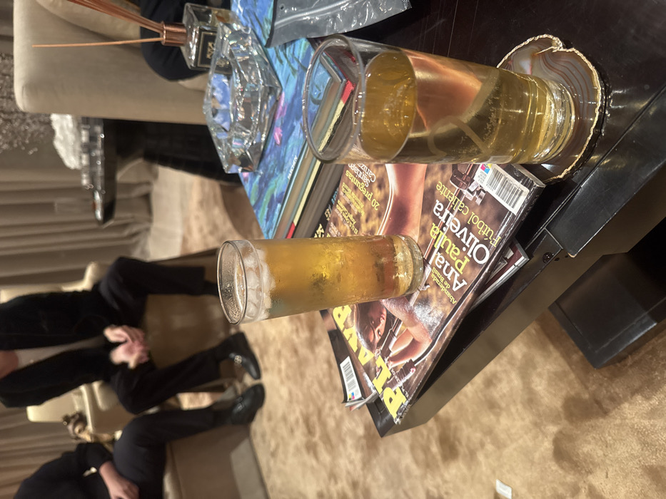 Two glasses of amber liquid rest on a dark table atop a stack of magazines. One glass sits on a decorative coaster. Books, a decorative glass container, and a fragrance diffuser are visible nearby. In the background, two individuals are seated on upholstered furniture, their legs and feet visible. The floor is covered in tan carpet.
