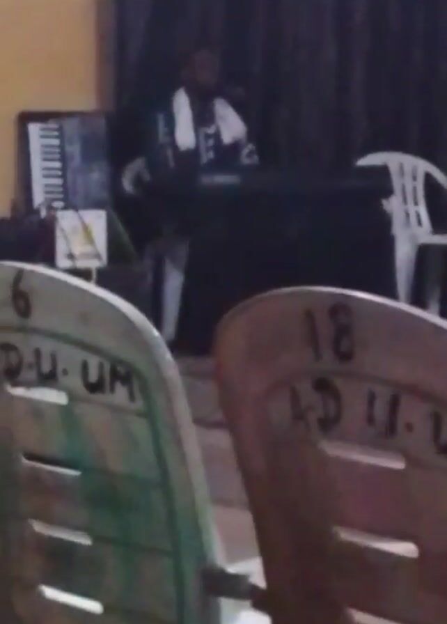 A man is playing a keyboard while singing in front of a curtain. There are two empty plastic chairs in the foreground with writing on them.