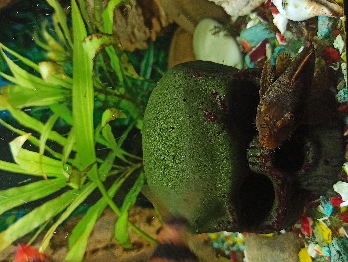A green aquarium plant with long, thin leaves occupies the left side of the frame. A green, moss-covered skull decoration is centrally located. A brown Bristlenose Pleco fish clings to the right side of the skull. The background features colorful aquarium gravel, rocks, and other decorations. The scene is captured in a close-up shot, highlighting the textures and details of the aquarium environment and its inhabitants.