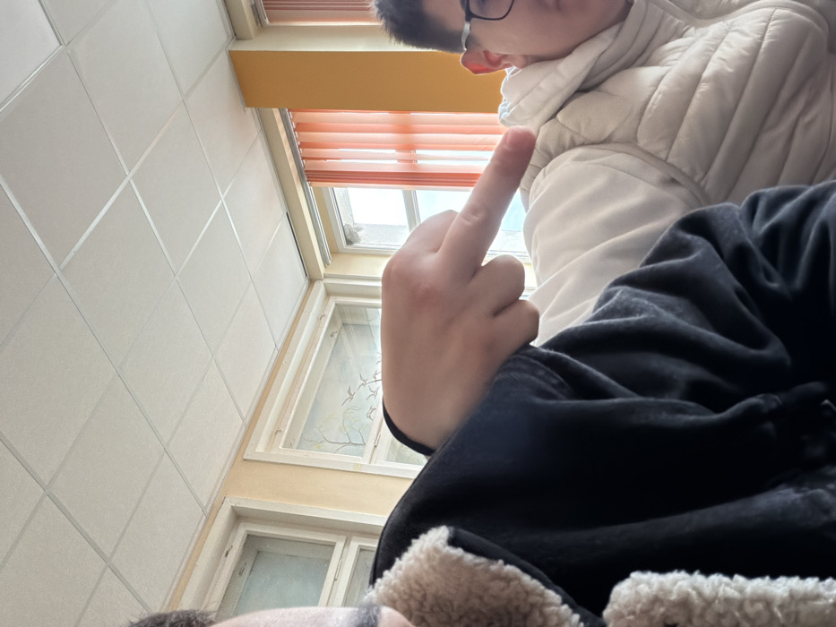 An indoor photograph depicts two individuals within what appears to be a classroom or institutional environment in the city of Panagyurishte, Bulgaria. The left foreground shows the partial profile of an individual, including their left shoulder and arm, clad in a dark jacket with a light, possibly sherpa-lined, collar. This individual's right hand is extended forward, with the index finger pointing directly towards a second individual situated to the right. The second individual is partially visible from the mid-torso upward, wearing a white, quilted vest and dark-rimmed eyeglasses. The background features light-colored walls, with a distinct vertical section of a solid orange or yellow hue on the far right. Multiple large windows with white frames are present; one window behind the foreground subject displays a subtle etching or decal of birds and branches. A window on the right is covered by orange or peach vertical blinds. The ceiling consists of a suspended grid system fitted with white square acoustic tiles.