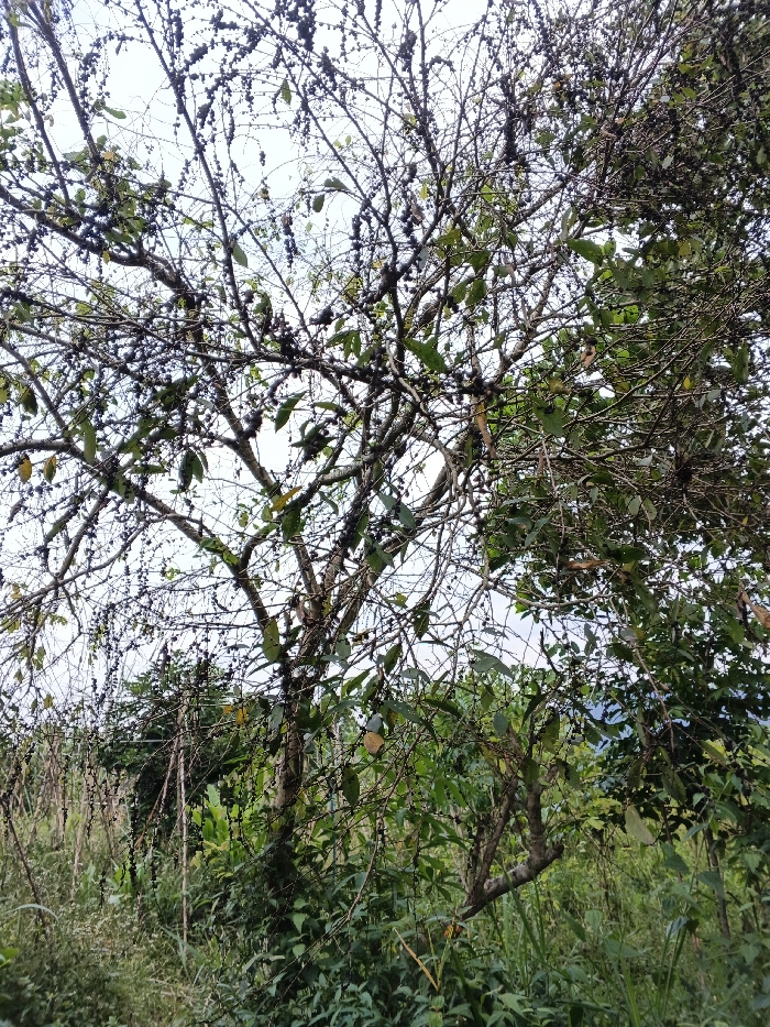 The image depicts a natural, vegetated outdoor scene consistent with a rural or peri-urban area within or near Chengdu, China. The central focus is a medium-sized tree, likely a fruit-bearing species, with numerous slender, light-brown branches. Many of these branches are largely bare of leaves but are densely covered with clusters of small, dark, spherical fruits or seeds, appearing purplish-black. Some green leaves, along with a few yellowed or brown ones, are visible on various branches. The lower portion of the frame shows a thick undergrowth of diverse green vegetation, including tall grasses and various shrubs, indicating an uncultivated environment. In the background, particularly on the right, additional trees and foliage are present. The sky above is uniformly light gray or white, suggesting an overcast condition, providing diffused lighting across the scene with no distinct shadows. No people, animals, or man-made structures are visible.