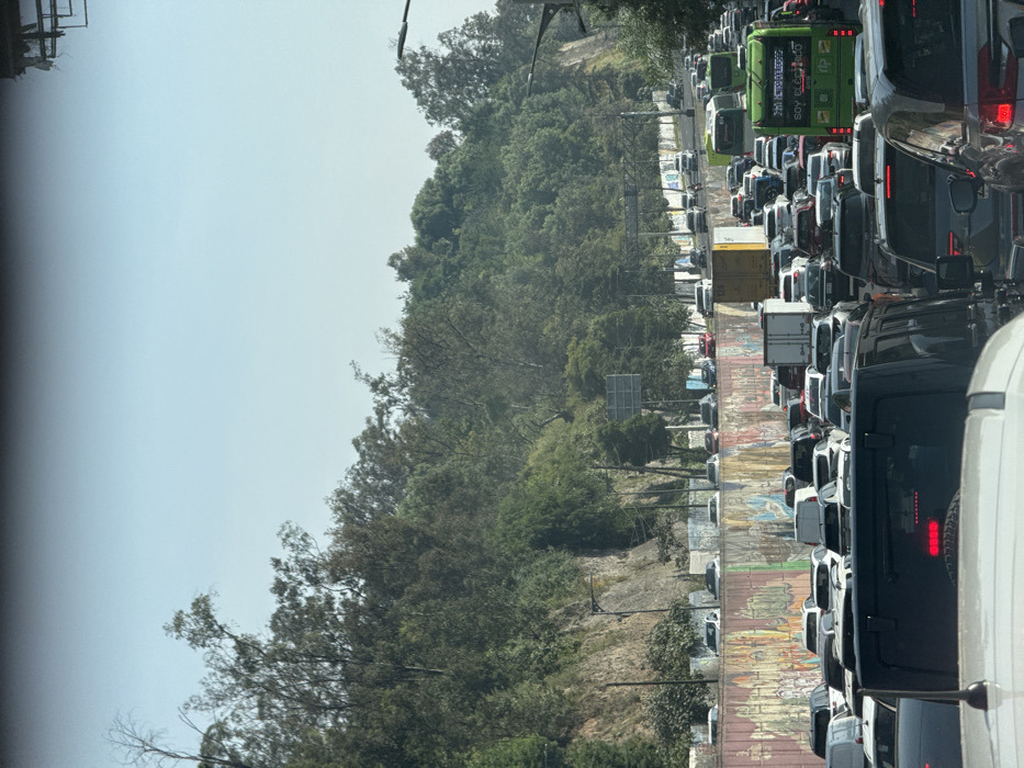 The image depicts a severe traffic jam on a multi-lane highway in Santa Fe, Mexico City