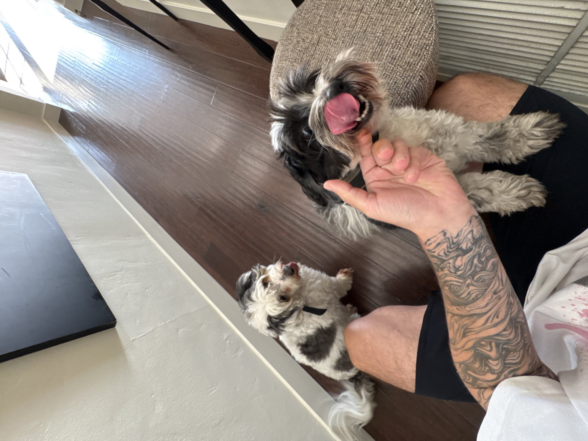 The image depicts an indoor domestic scene, presumably located in Los Angeles, United States of America. The frame presents a partial, first-person view of a human interacting with two small, fluffy dogs. A human's left forearm, adorned with a full-sleeve tattoo featuring interwoven black and grey curvilinear patterns, is positioned centrally, gently touching the chin of a small, black and white dog. This dog, with a white muzzle and a prominent black patch around its left eye, is looking upwards with its pink tongue extended, actively licking its nose. A black collar is visible around its neck. To the left, further back on the dark brown, glossy hardwood floor, sits a second small dog, predominantly white with grey patches on its back and head. This dog faces forward with its tongue slightly visible, also wearing a black collar. The human's bare legs, clad in black shorts, are visible beneath the arm. The background features a light-colored, textured wall with a white baseboard and a dark, rectangular object mounted high on the wall. Bright reflections on the floor suggest natural light entering from an off-camera source to the right. A textured brown fabric surface, likely part of a chair or cushion, is partially visible on the far right.