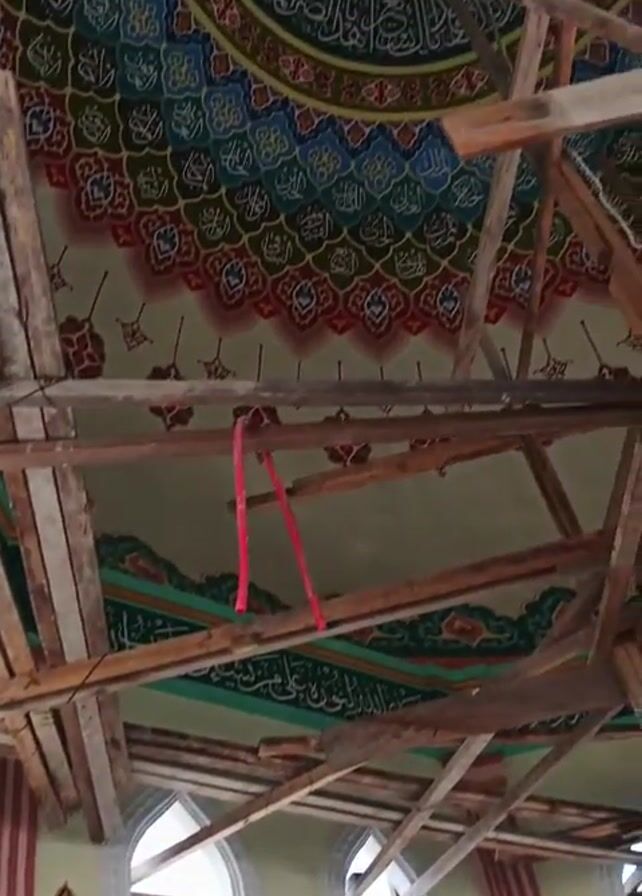 The video pans up and across the interior of what appears to be a mosque under construction or renovation