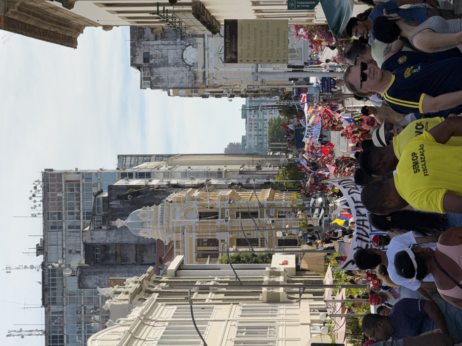 An urban scene shows a crowd of people gathered in a street lined with buildings. Many are carrying flags and signs, suggesting a protest or demonstration. A notable yellow and white building with a dome stands among the structures. A sign indicates the "Rota de Pedestre," pointing towards locations like "Fund. Pierre Verger" and "Elevador Lacerda." People in the foreground include individuals wearing yellow shirts with "SEMOP FISCALIZAÇÃO" printed on them.