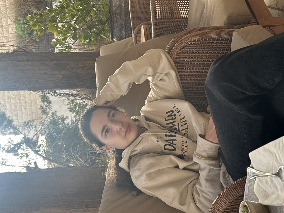 A young adult female is seated outdoors in Safed, Israel, occupying a light brown cushioned wicker chair