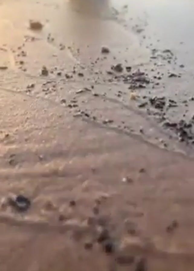 The camera angle is low, focusing on the sand of a beach, with ocean water in the background at sunset