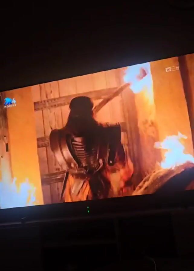 television screen displaying a scene from a movie or show